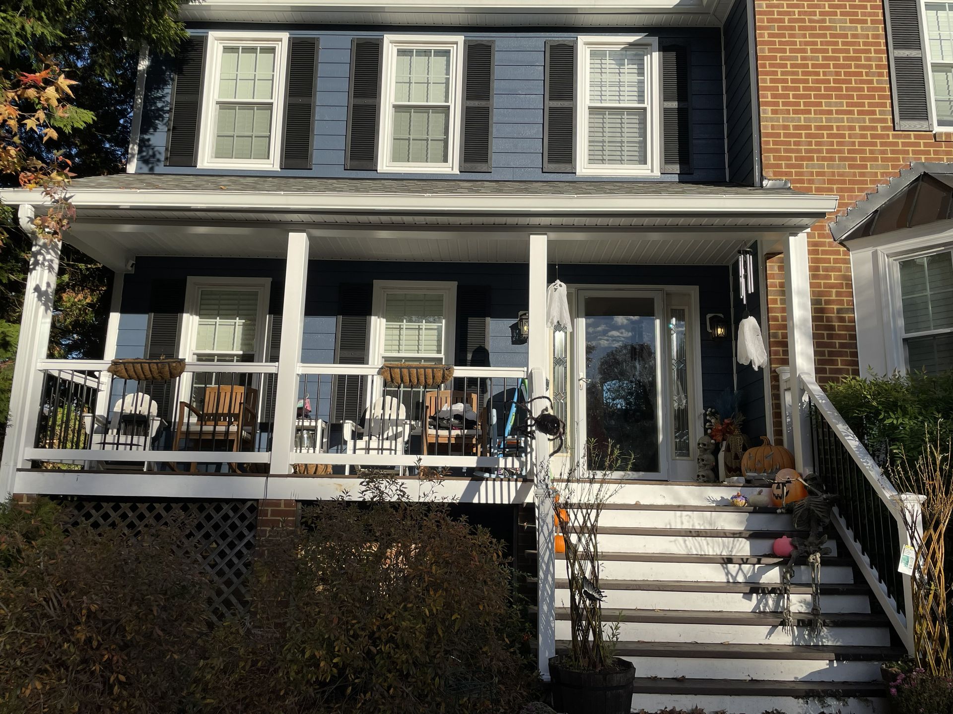 We also did a front porch reface by installing new columns and railings then wrapping them with white vinyl sleeves along with the installation of a new white vinyl solid soffit ceiling. Finished up by wrapping all windows and doors in new white metal This exterior makeover completely revitalized the home—you can truly see the impact it made!