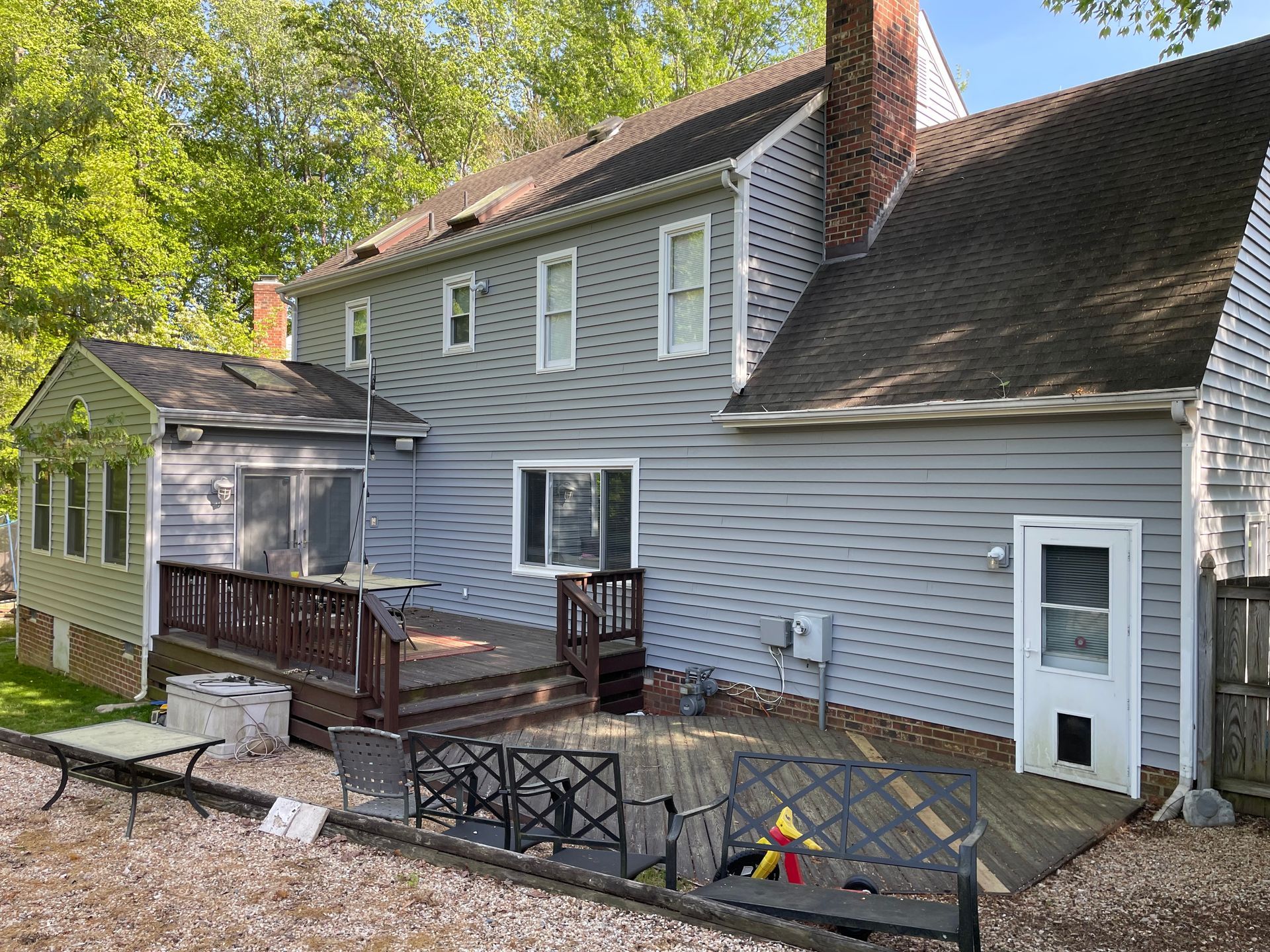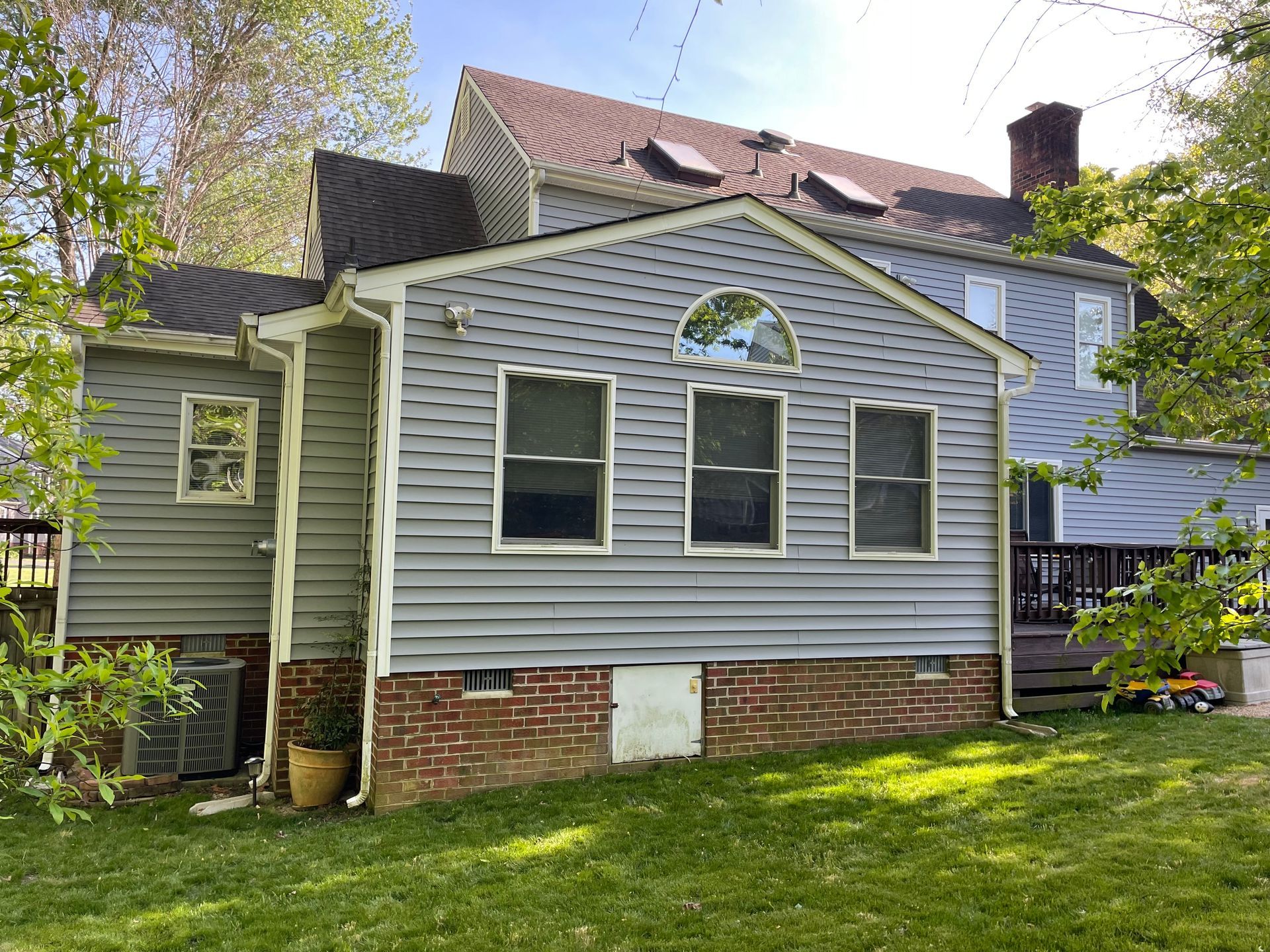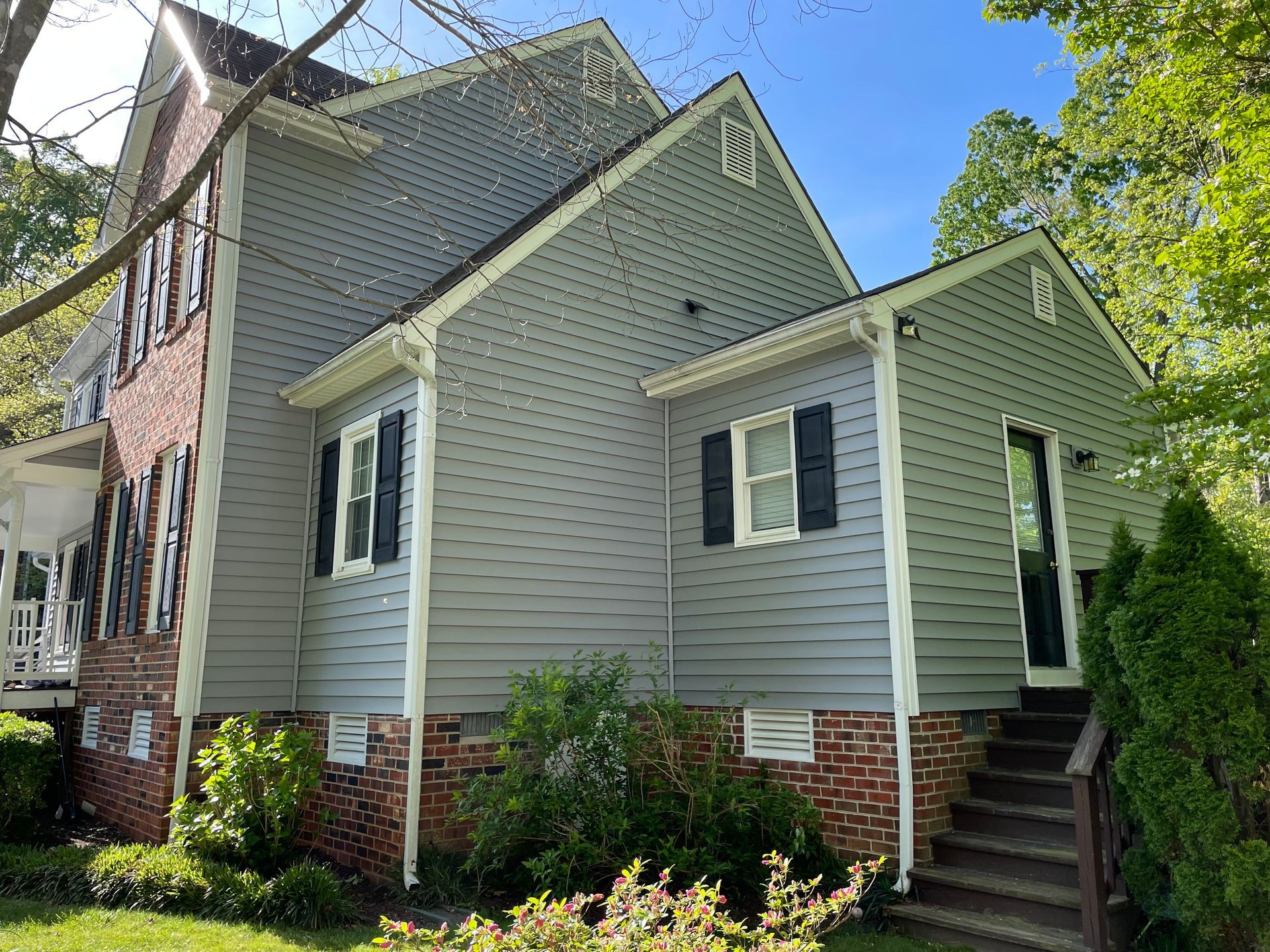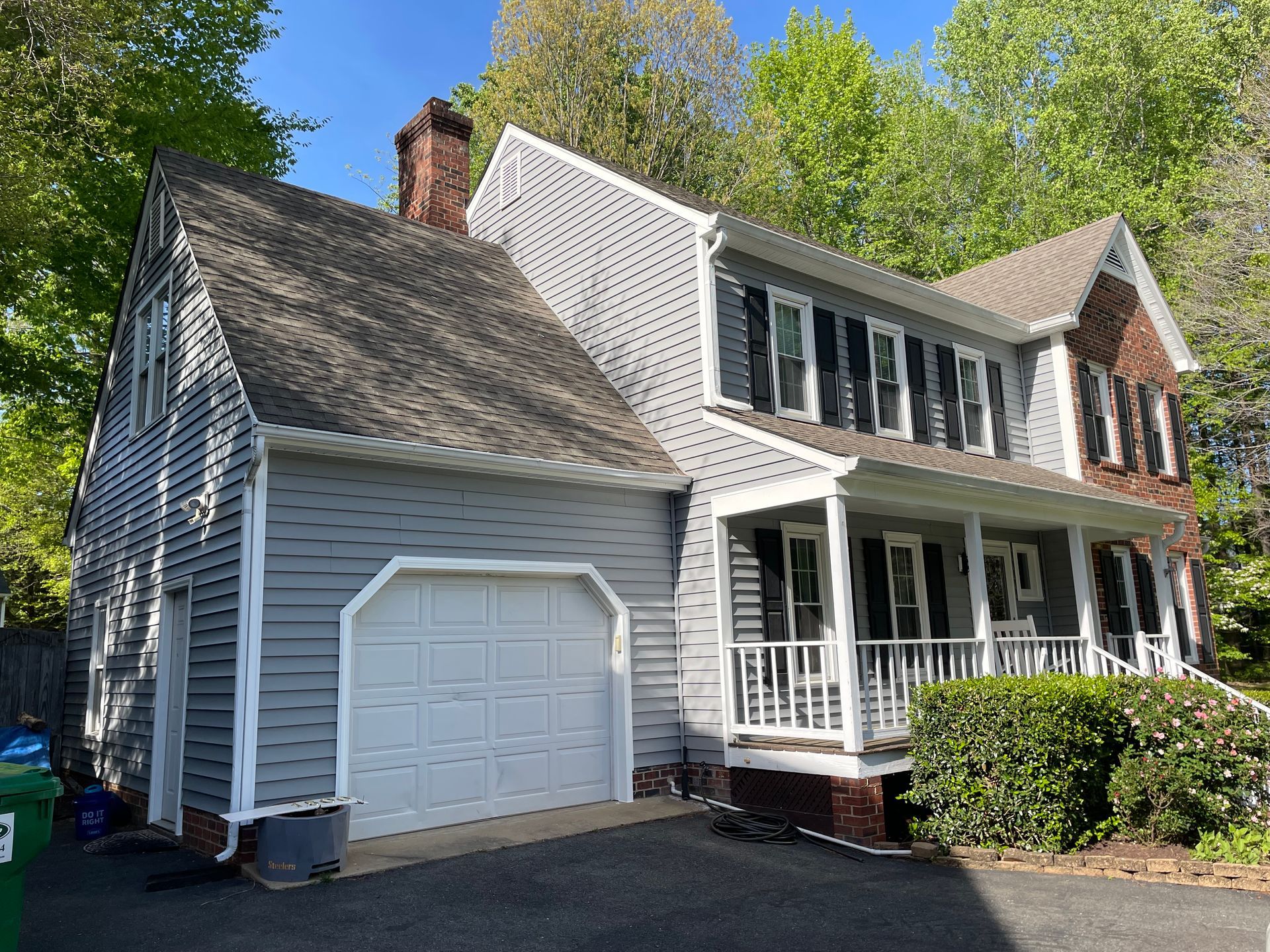 We gave this home a fresh new look with Cedar Knolls D5 Straight siding in Granite and crisp white trim. The project included a full tear-off, new house wrap, updated soffits and trim, wrapped porch beam and garage door jams, and new panel shutters in black. We finished it off by reinstalling lights, gutters, and shutters, plus sealing everything for a clean, long-lasting upgrade.