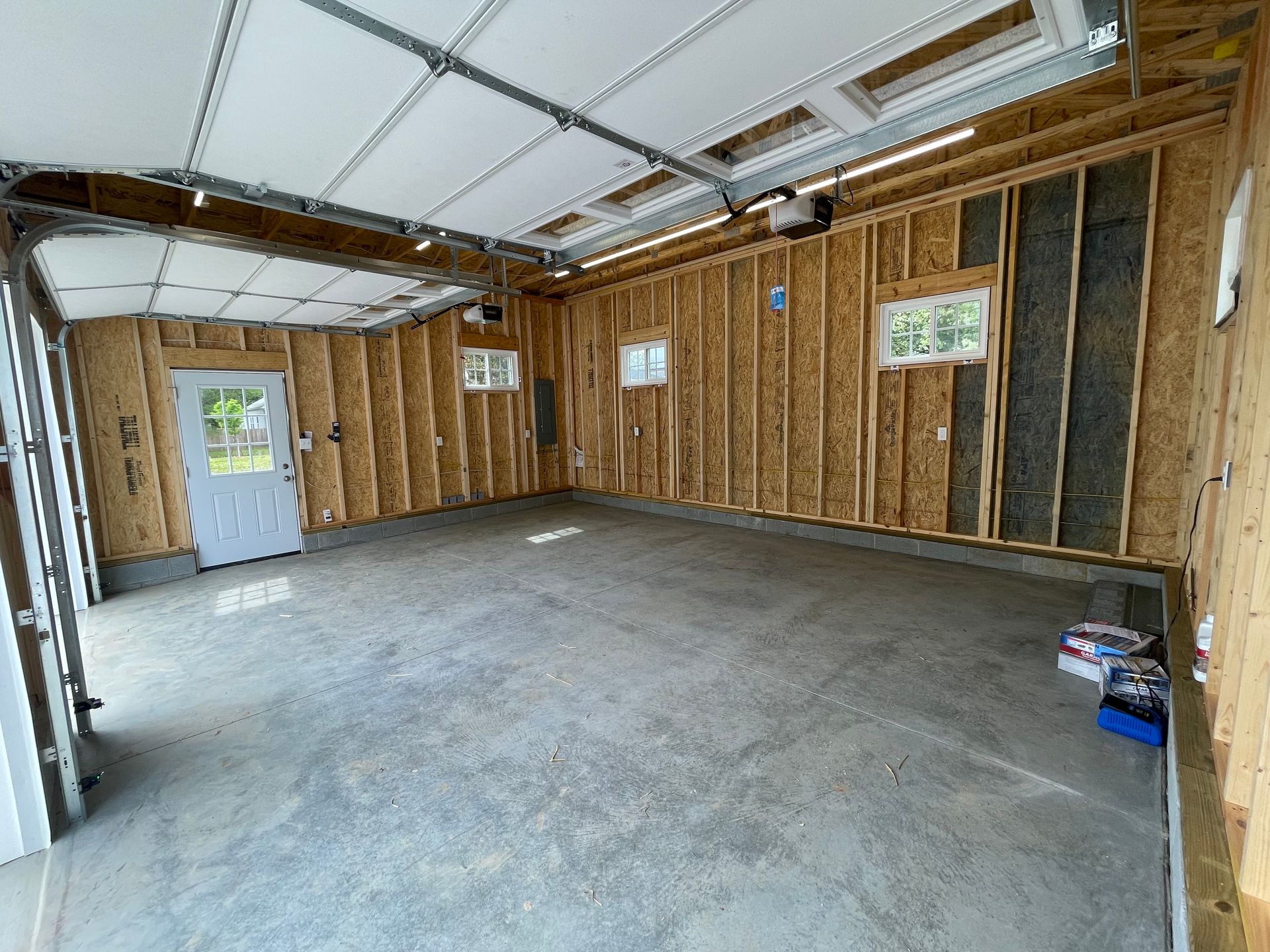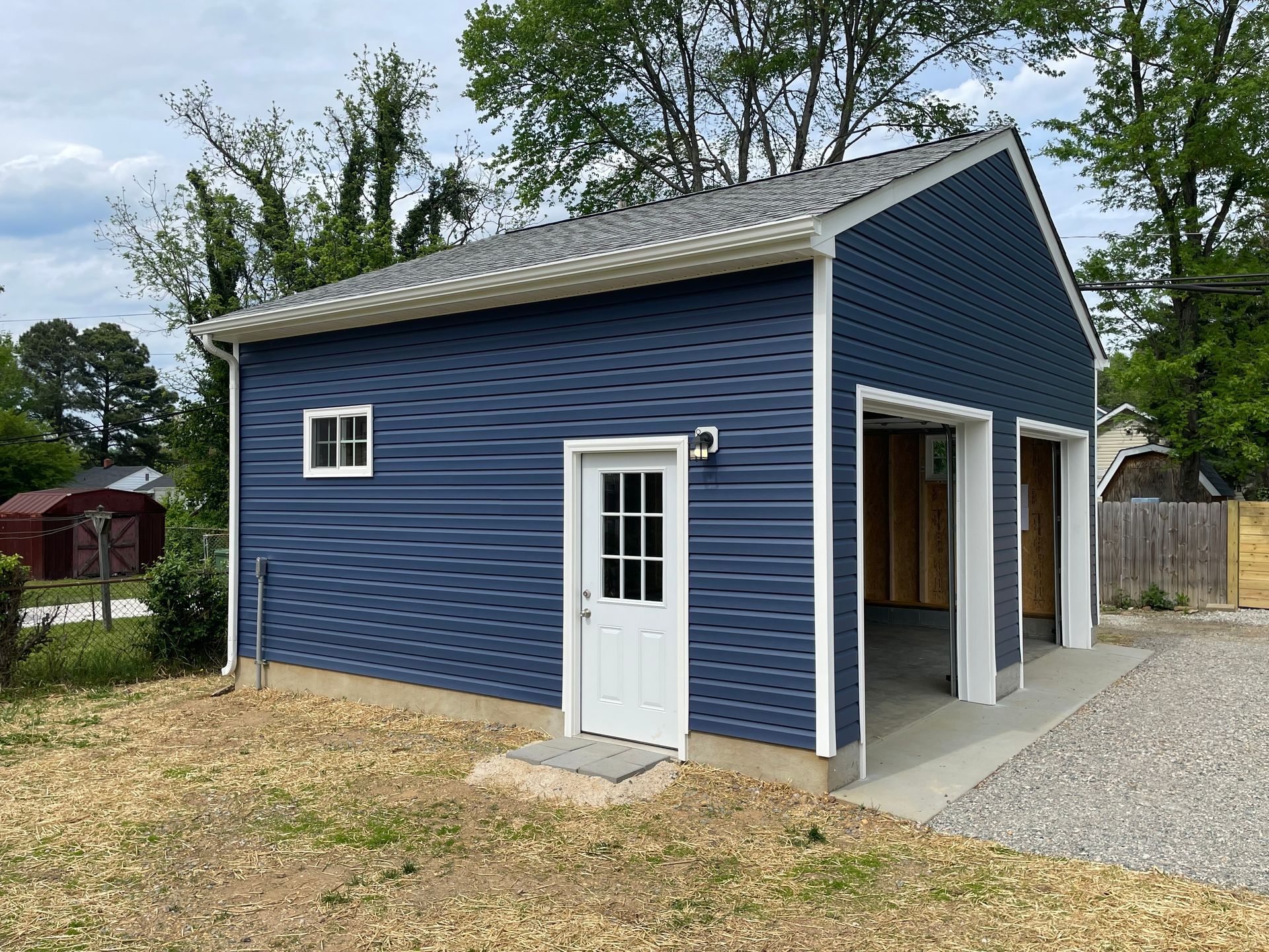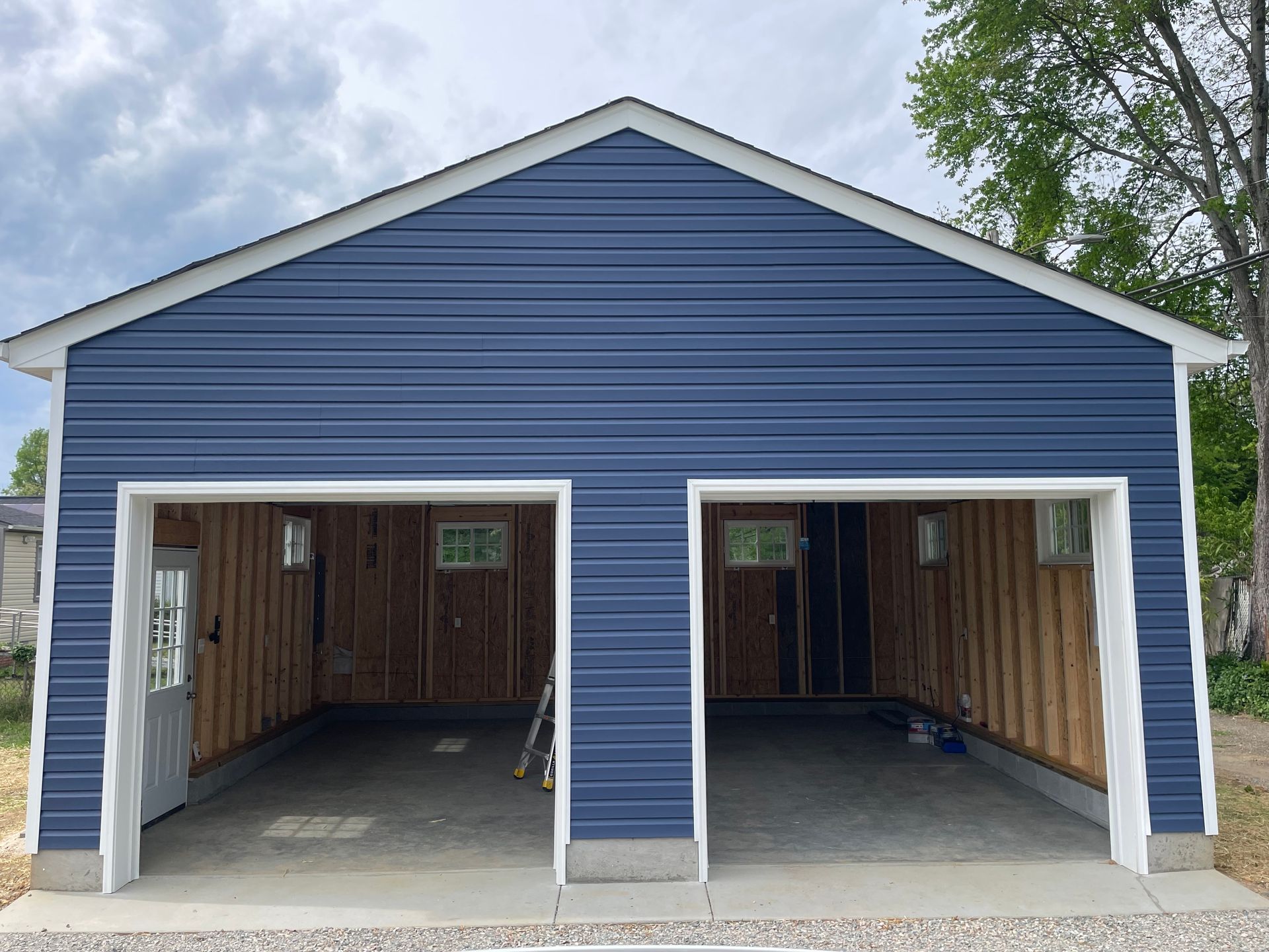 We built a 24'x20' unfinished detached garage in Richmond.. The project included full site prep—clearing, grading, installing footings, a CMU block foundation with matching veneer, and a 4" concrete floor with apron. Exterior finishes matched the home, including Tamko Heritage roofing in Olde English Pewter and Woodsman Select, D5 Straight siding in Steel Blue, white trim. The garage had four vinyl windows, one pedestrian door, two insulated 9'x8' garage doors with openers, and a complete electrical setup, including new 200-amp service.
