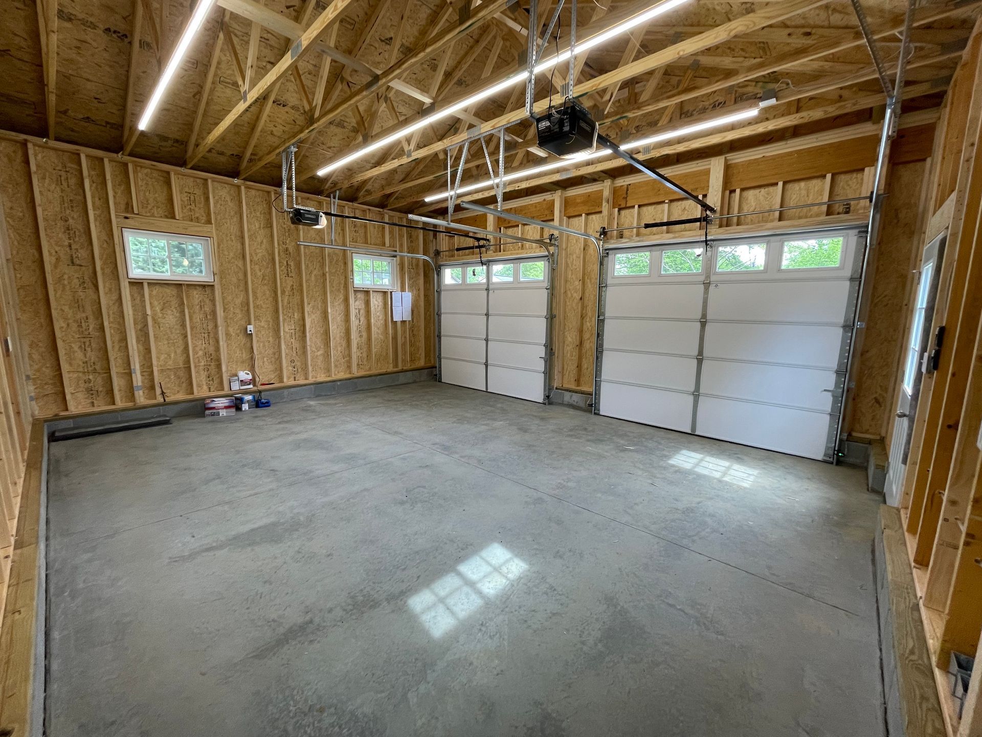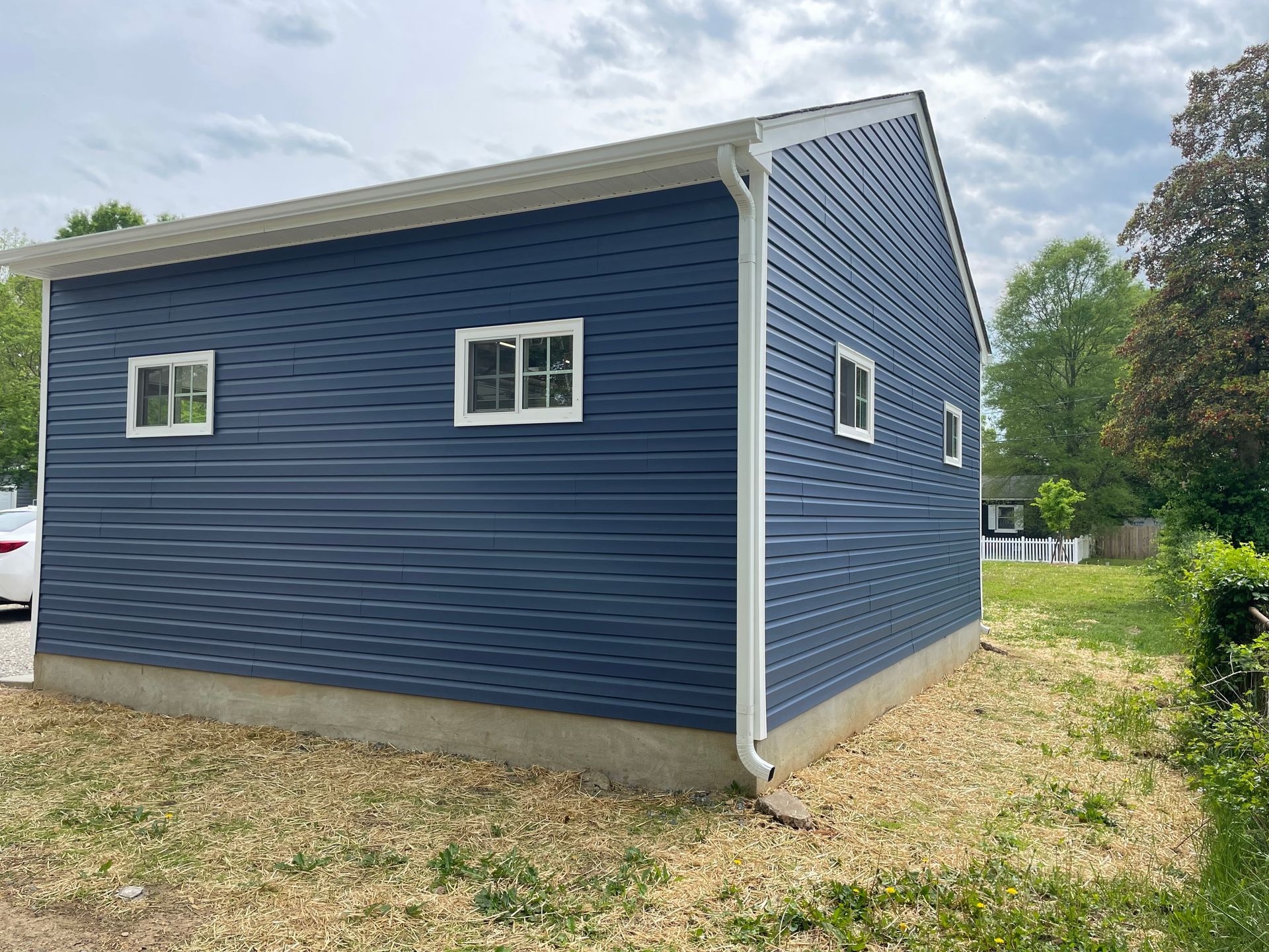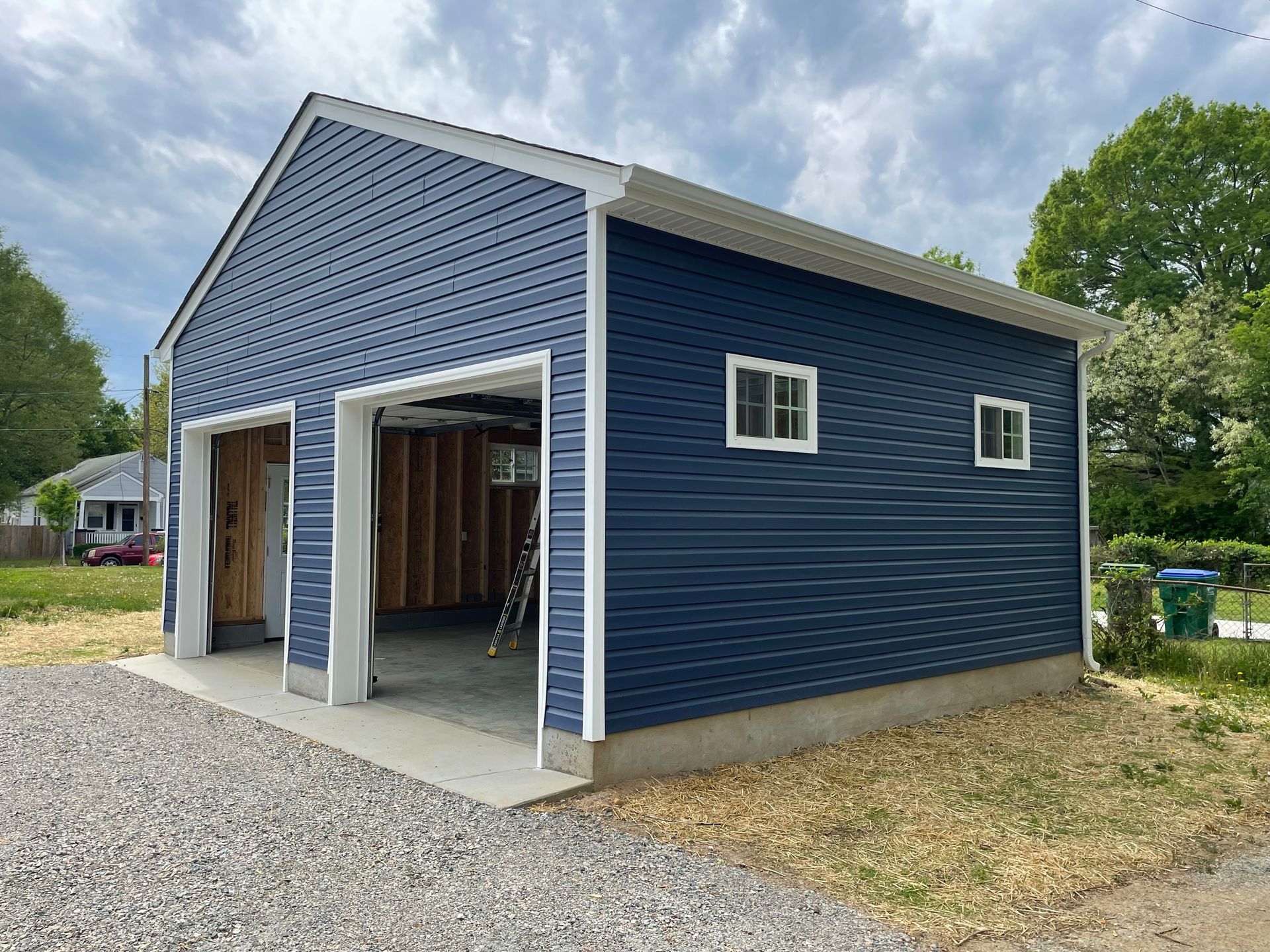 We built a 24'x20' unfinished detached garage in Richmond.. The project included full site prep—clearing, grading, installing footings, a CMU block foundation with matching veneer, and a 4" concrete floor with apron. Exterior finishes matched the home, including Tamko Heritage roofing in Olde English Pewter and Woodsman Select, D5 Straight siding in Steel Blue, white trim. The garage had four vinyl windows, one pedestrian door, two insulated 9'x8' garage doors with openers, and a complete electrical setup, including new 200-amp service.