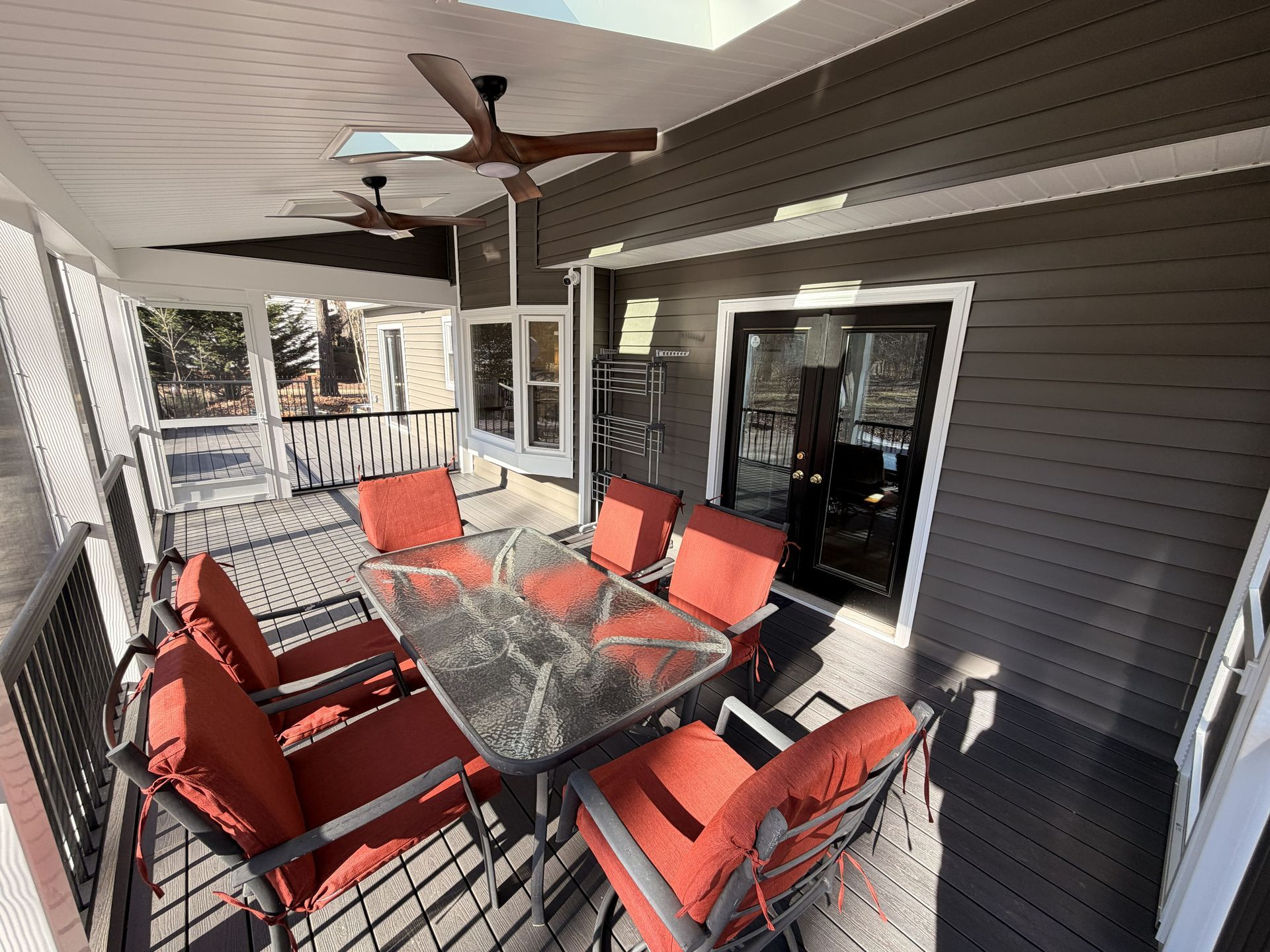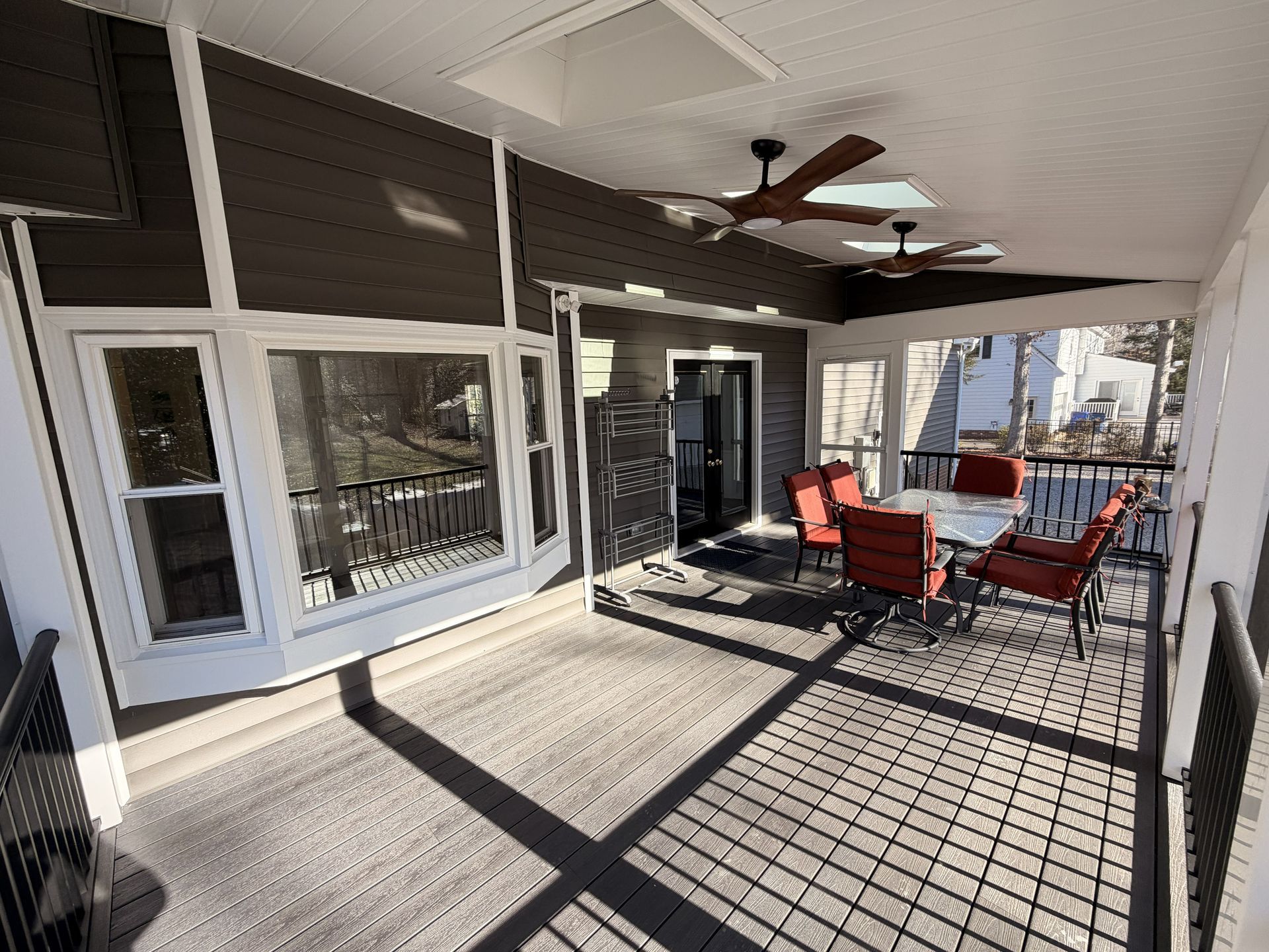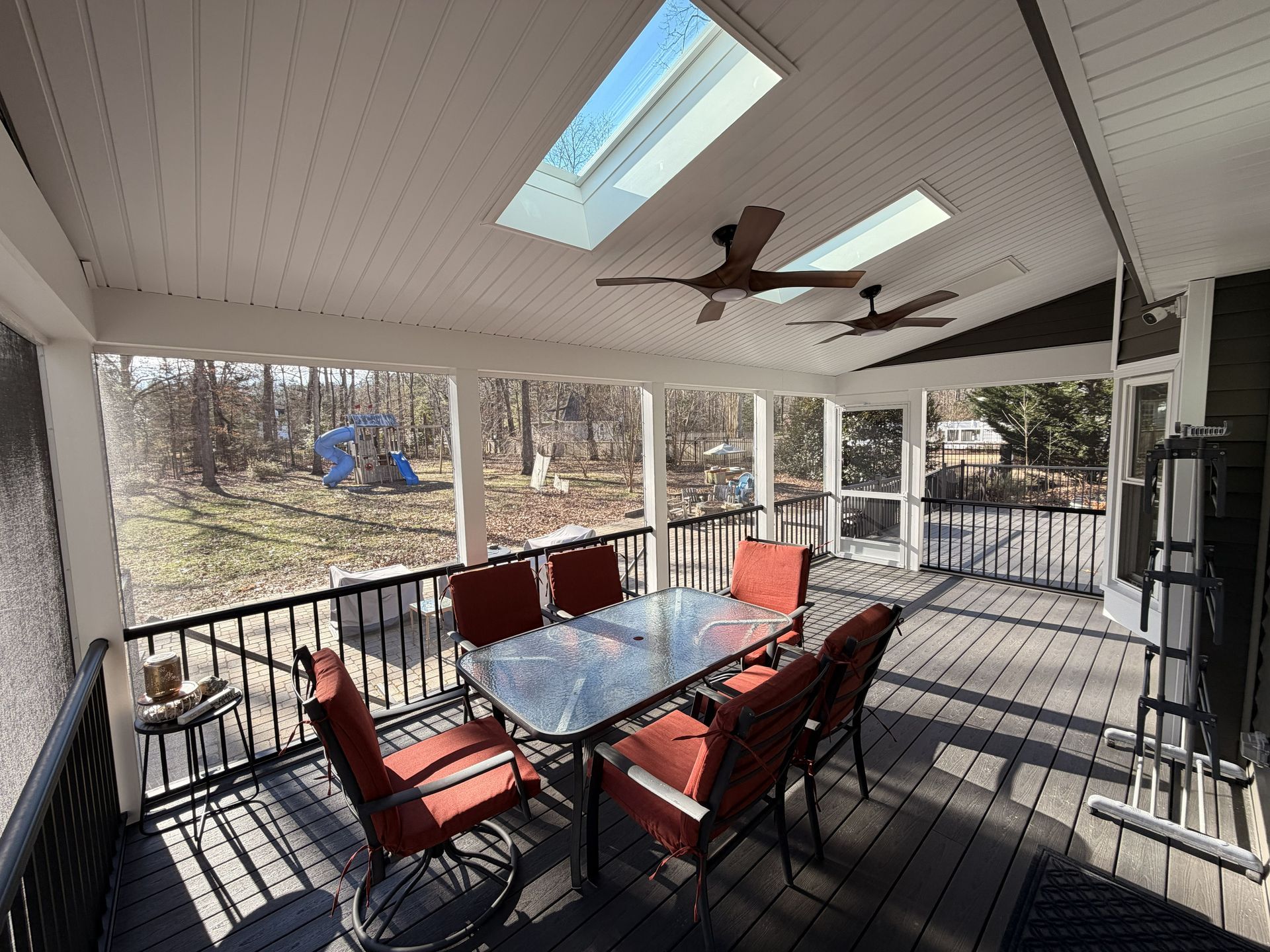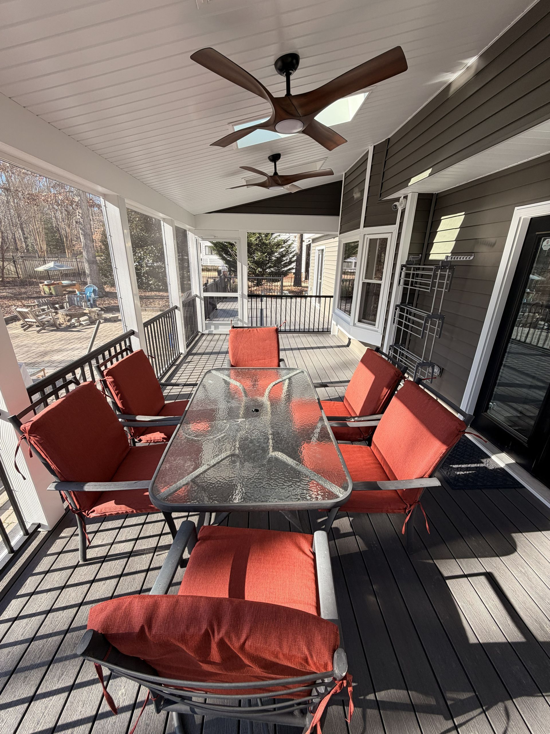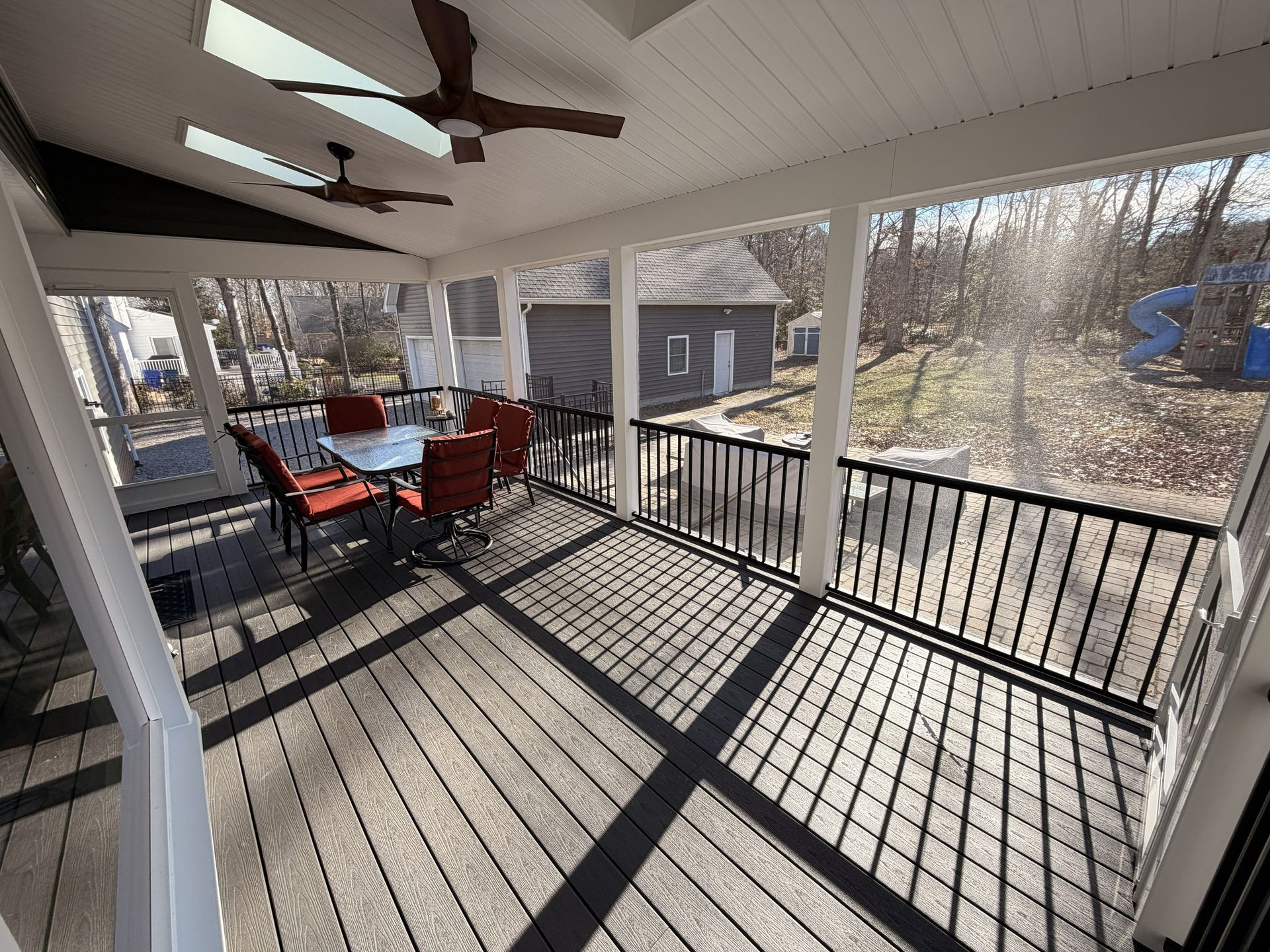 They selected composite decking made by Fiberon in the color Earl Grey creating a clean modern look. They opted for black RDI Aluminum Avalon rails for a sleek finish with a vaulted, white solid soffit ceiling and 3 skylights bringing in plenty of natural light. To tie everything together, they opted for horizontal deckboard lattice instead of traditional white lattice allowing it to match the deck boards. Finished with eze screen and 2 ceiling fans, making this entire area the perfect spot to enjoy the outdoors or simply watch their kids play in the backyard.