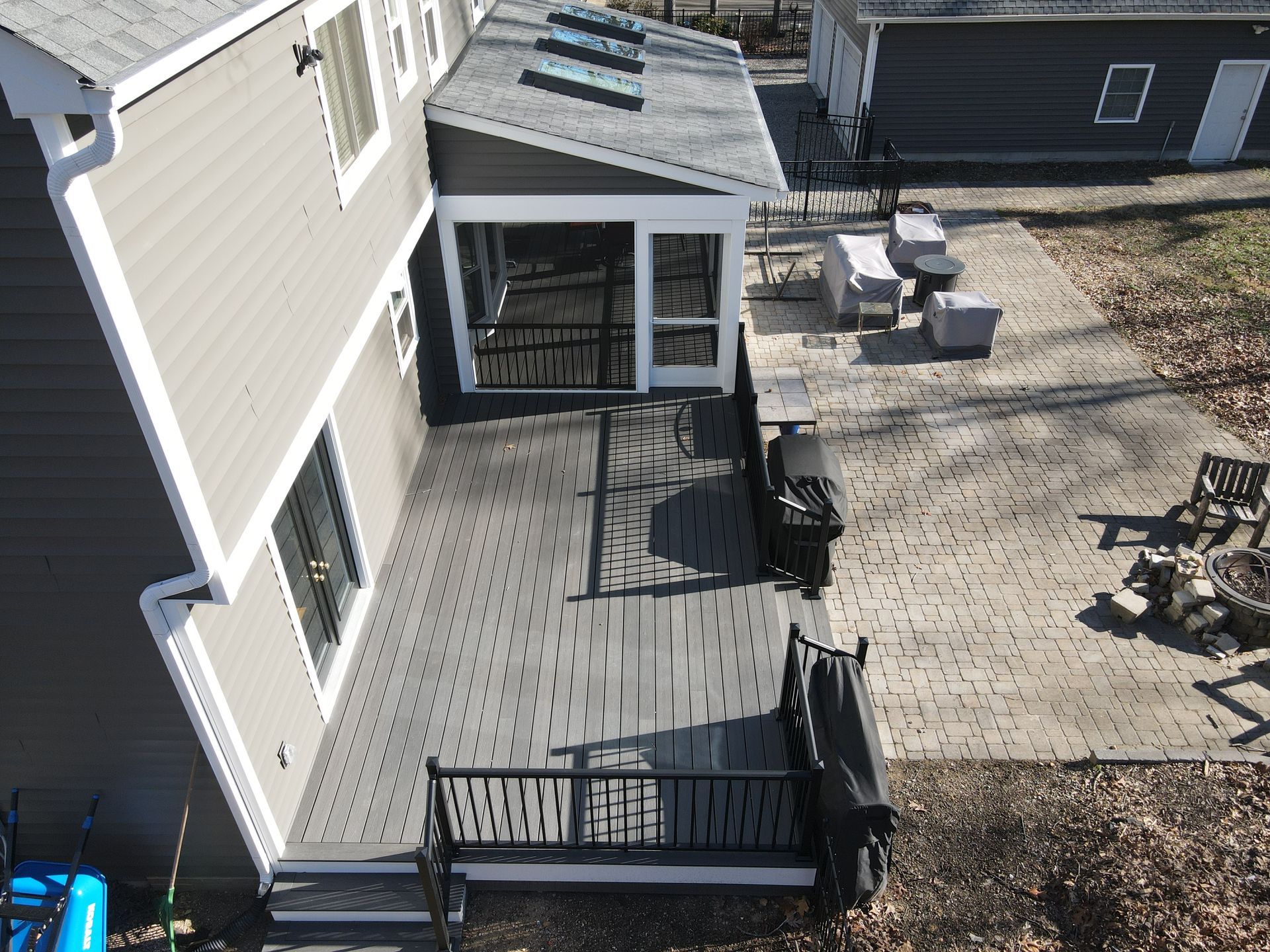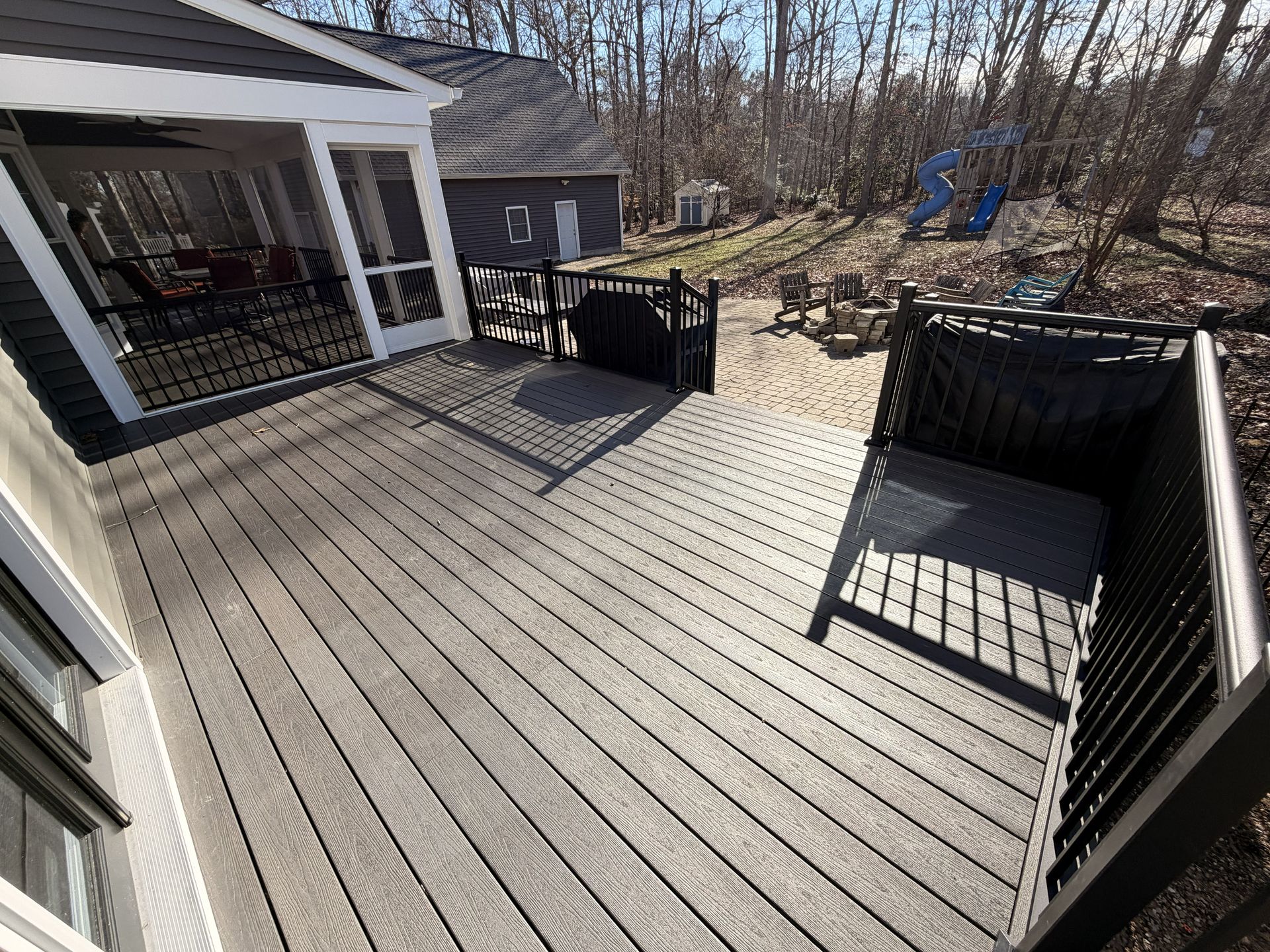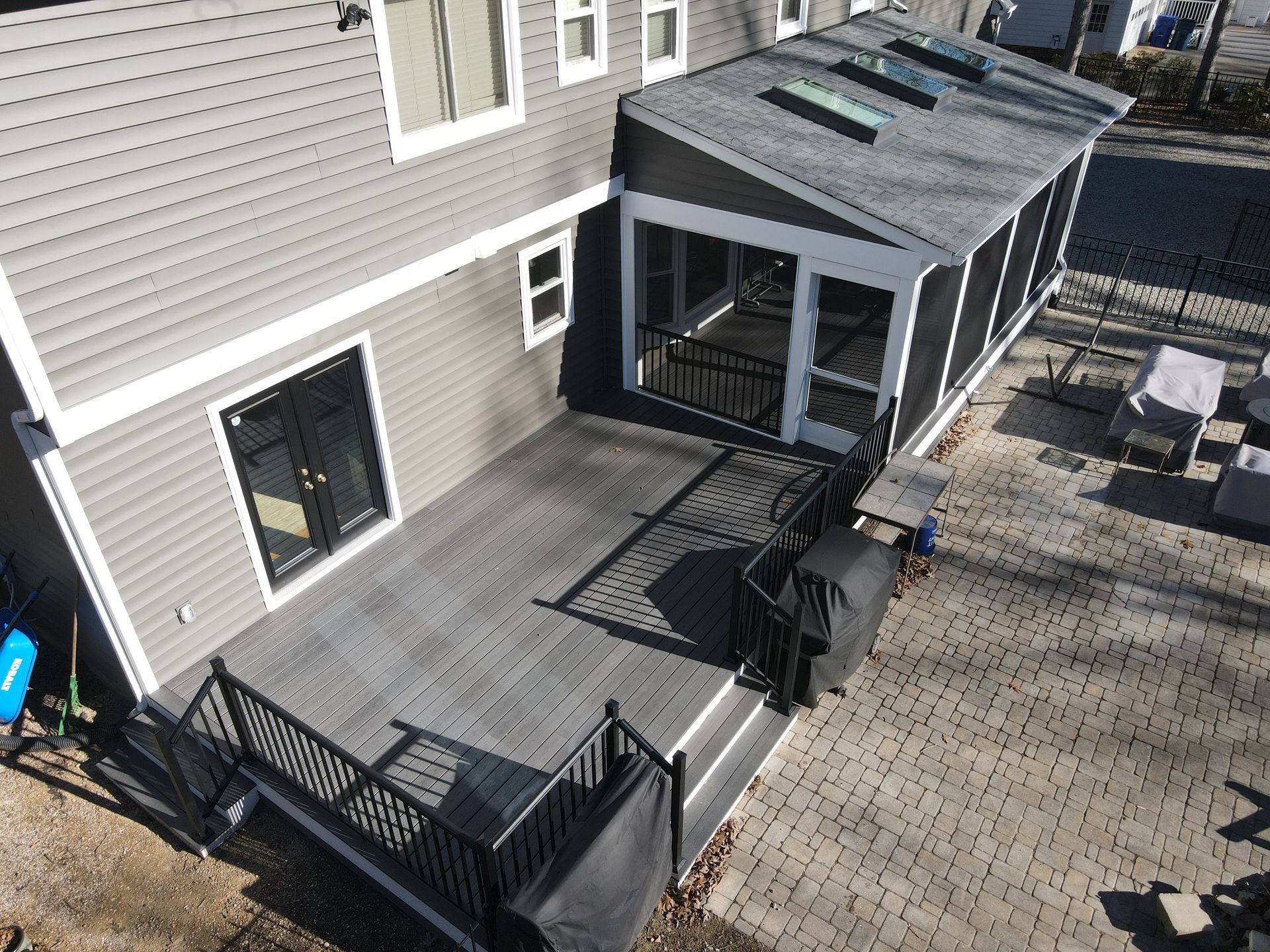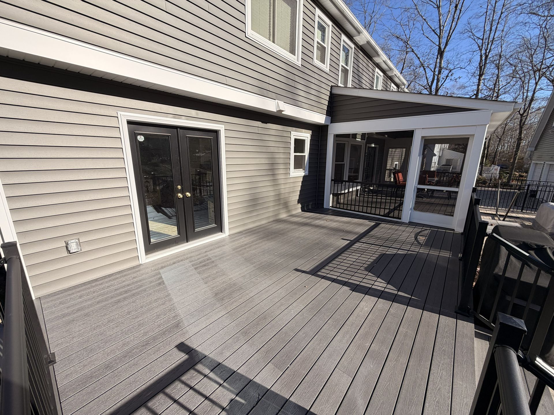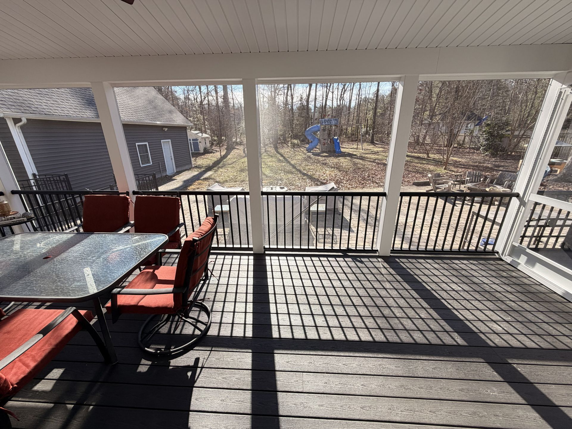 They selected composite decking made by Fiberon in the color Earl Grey creating a clean modern look. They opted for black RDI Aluminum Avalon rails for a sleek finish with a vaulted, white solid soffit ceiling and 3 skylights bringing in plenty of natural light. To tie everything together, they opted for horizontal deckboard lattice instead of traditional white lattice allowing it to match the deck boards. Finished with eze screen and 2 ceiling fans, making this entire area the perfect spot to enjoy the outdoors or simply watch their kids play in the backyard.
